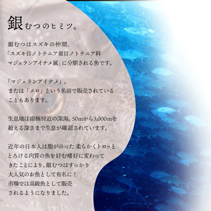 06/5/23 1610(編集あり) 『メロ』=『銀ムツ』本当の名前はマジェランアイナメ。 メロは1980年代からギンダラの代用品として日本に輸入され、『銀ムツ』という名前で流通することが多かったです。 しかし、アカムツやクロムツなどとは全く違う種類の メロウはどんな魚ですか切り身しか見たことありません、姿は、わかりません。>えっ違うんですか?「海外漁場魚介類及び外来種の名称例」学名(種名) :Dissostichus eleginoides標準和名 :なし使用できる名称:マジェランアイナ銀ムツ カマ (メロカマ)カマ西京漬約500g銀むつ めろ 味噌漬け 漬け魚 3,040円 (価格送料) 1,840 円 送料1,0円 18ポイント (1倍) 八代楽天市場店 銀ムツ カマ ( メロカマ )カマ西京漬約250g銀むつ/めろ/味噌漬け/漬け魚 2,170円 (価格送料) 970 円 送料1,0円 9ポイント (1倍) 八代楽天市場店 ふるさと納税まちのさかなやさん魚政の自家製焼魚・煮魚 セット 8切入 魚政 真鯛